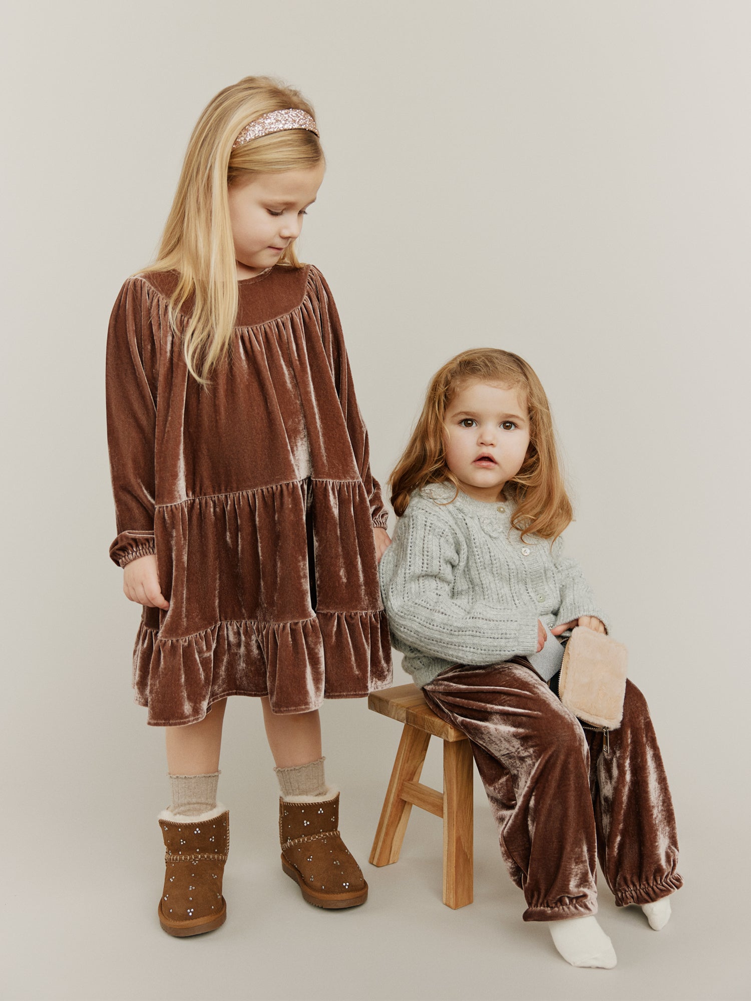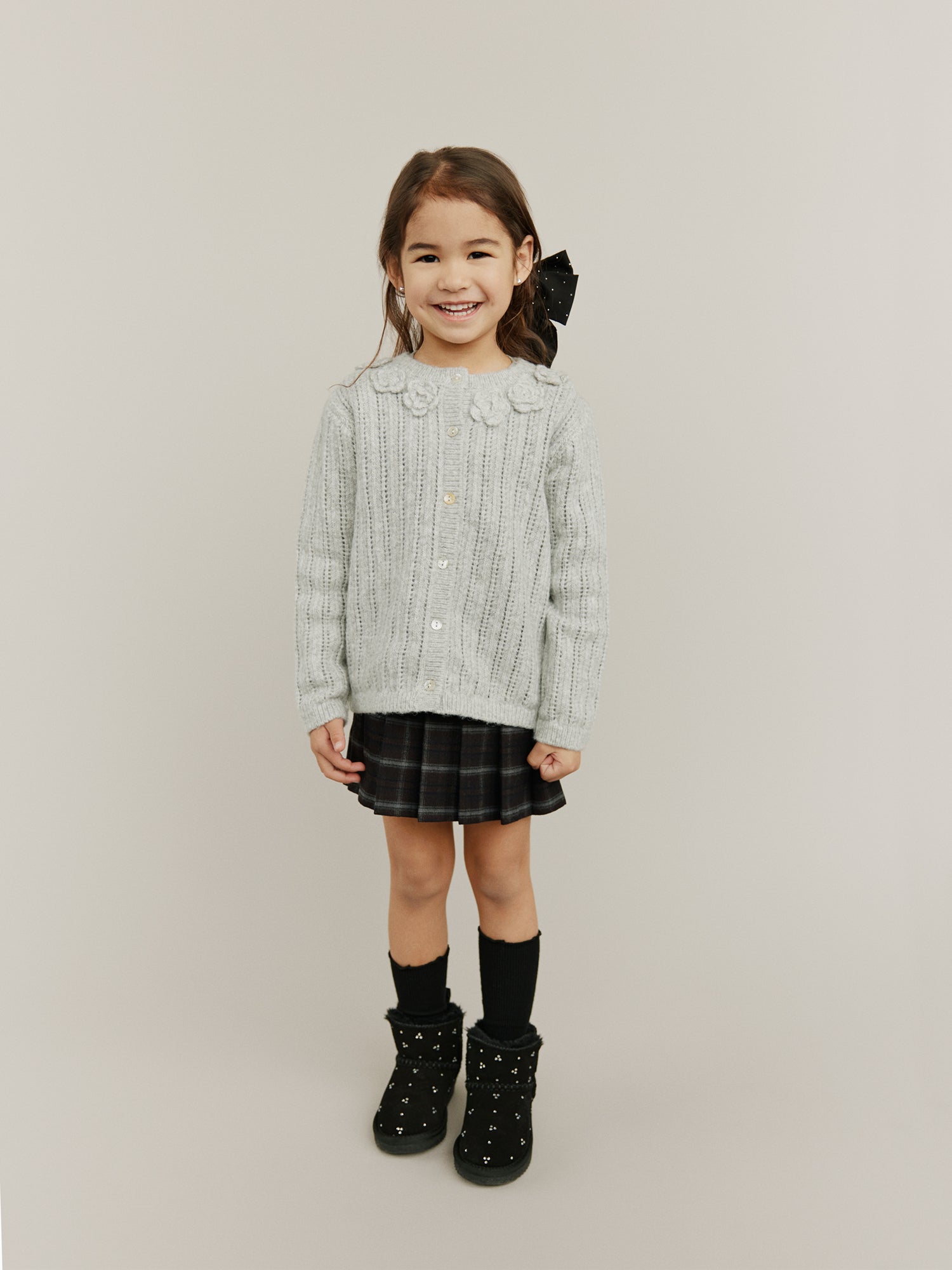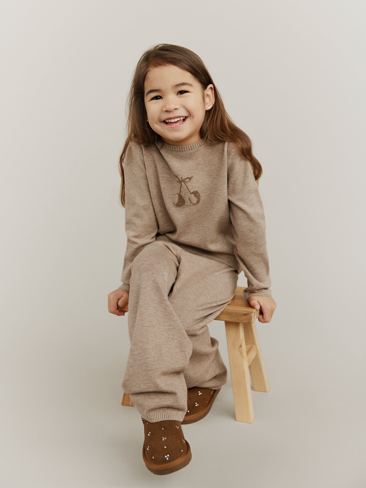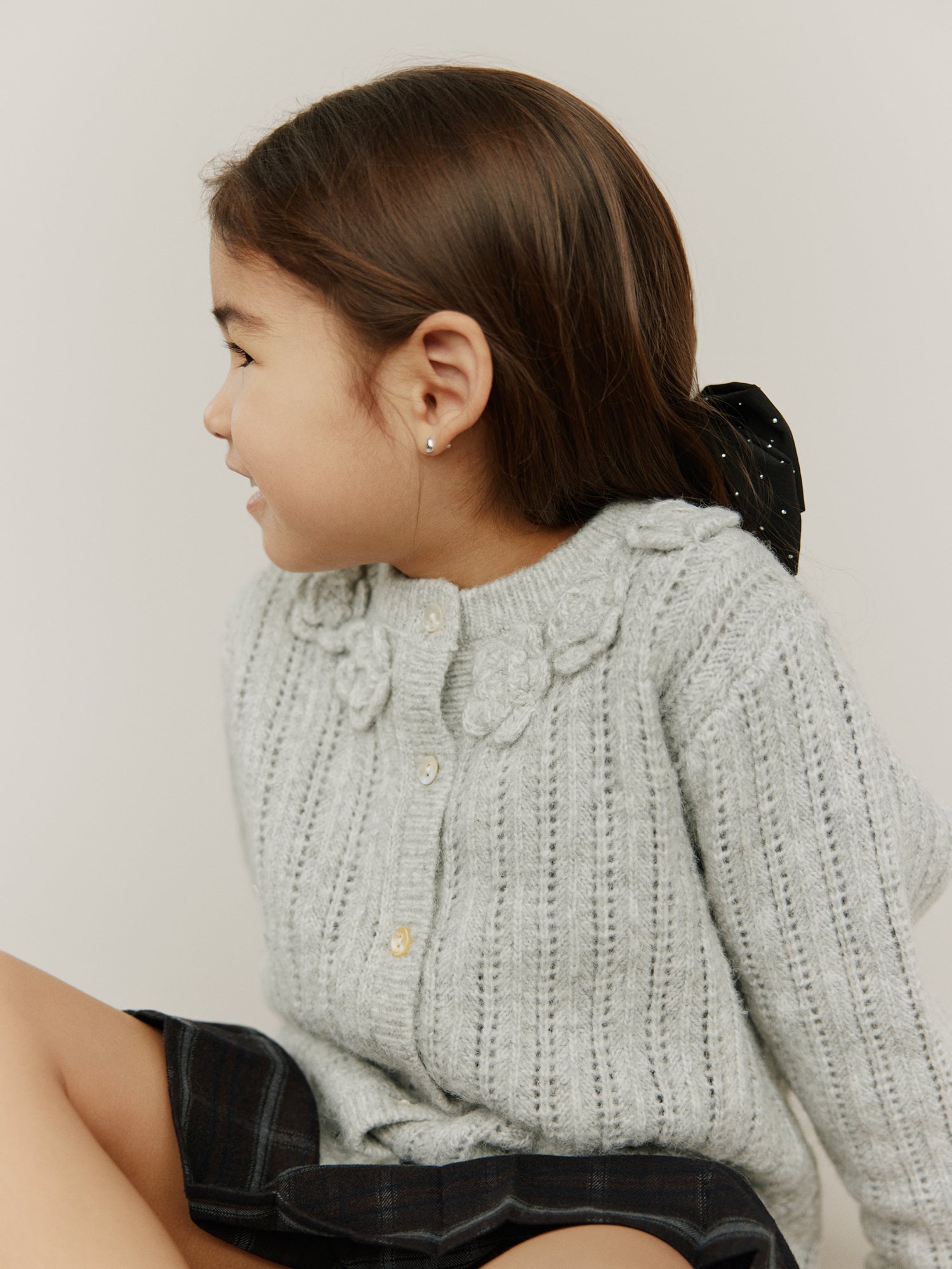 Hand-knitted sweaters, warm and soft checks, sweet flower applications as they twirl across marbled floors. Every piece carries a whisper of old Paris, where elegance meets childhood wonder.