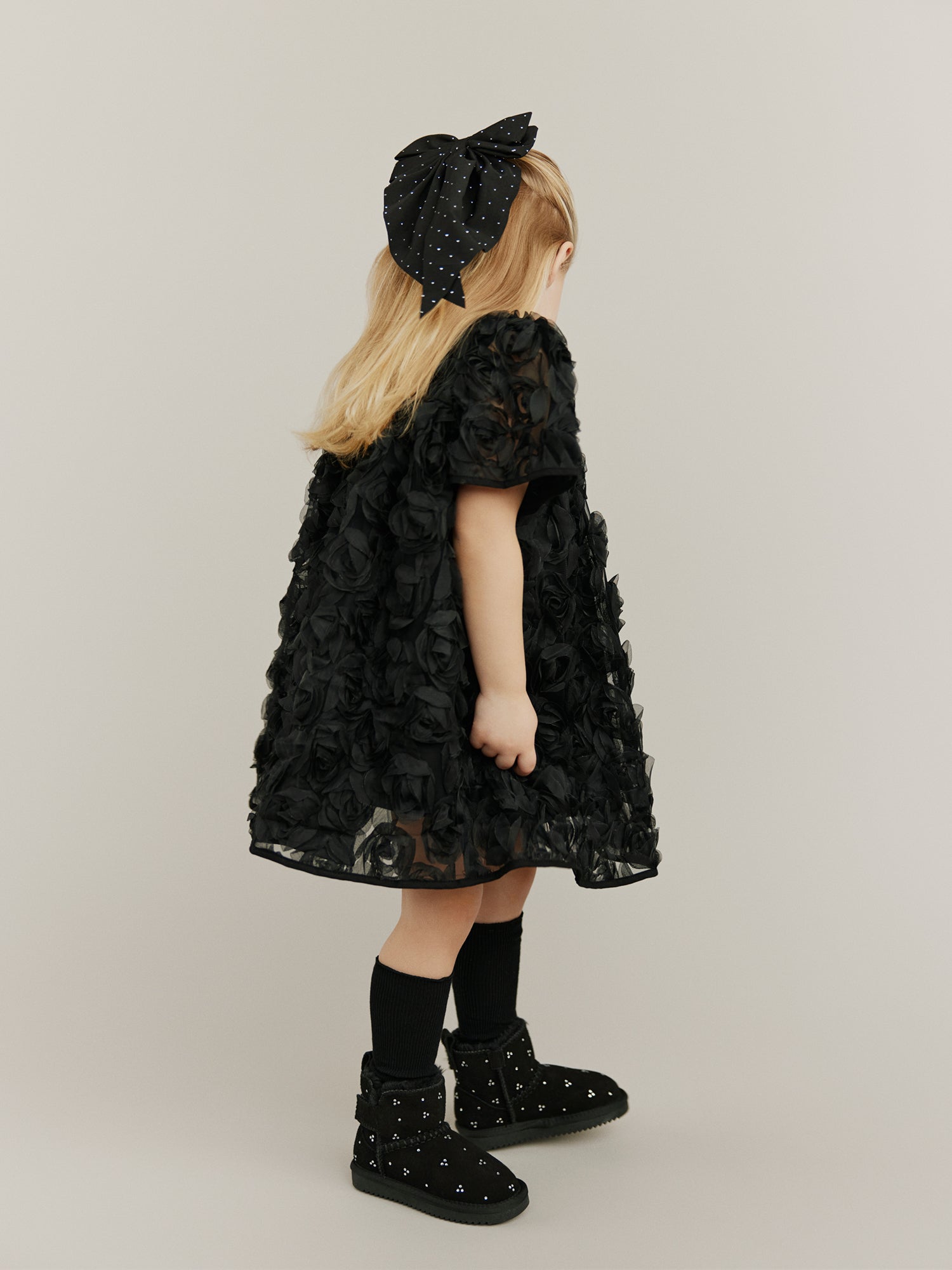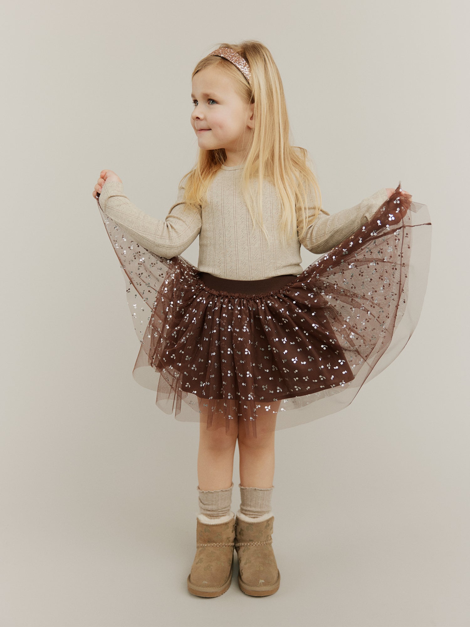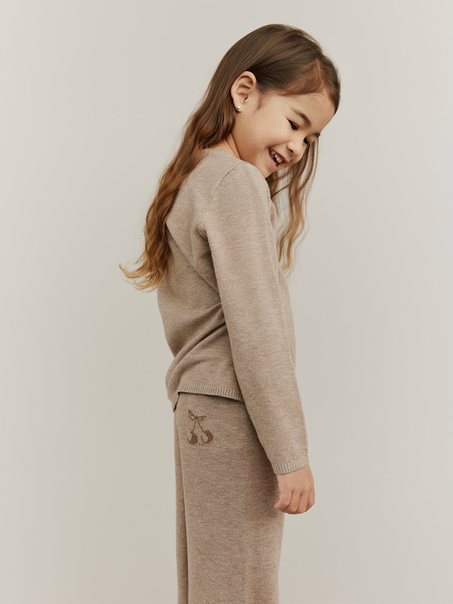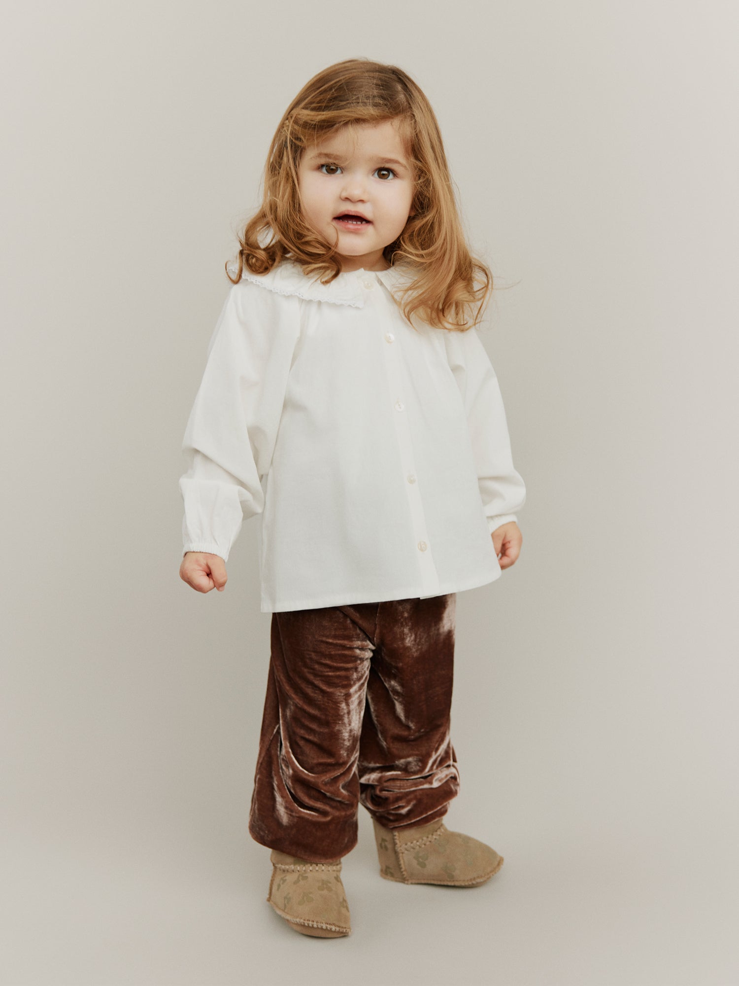 Hand-knitted sweaters, warm and soft checks, sweet flower applications as they twirl across marbled floors. Every piece carries a whisper of old Paris, where elegance meets childhood wonder.