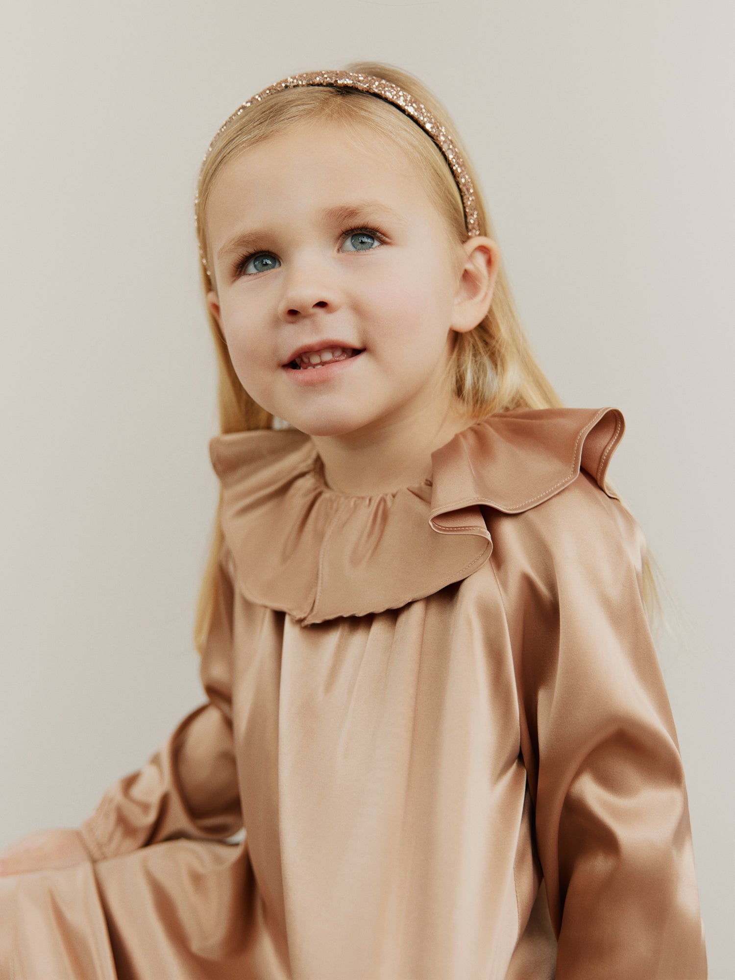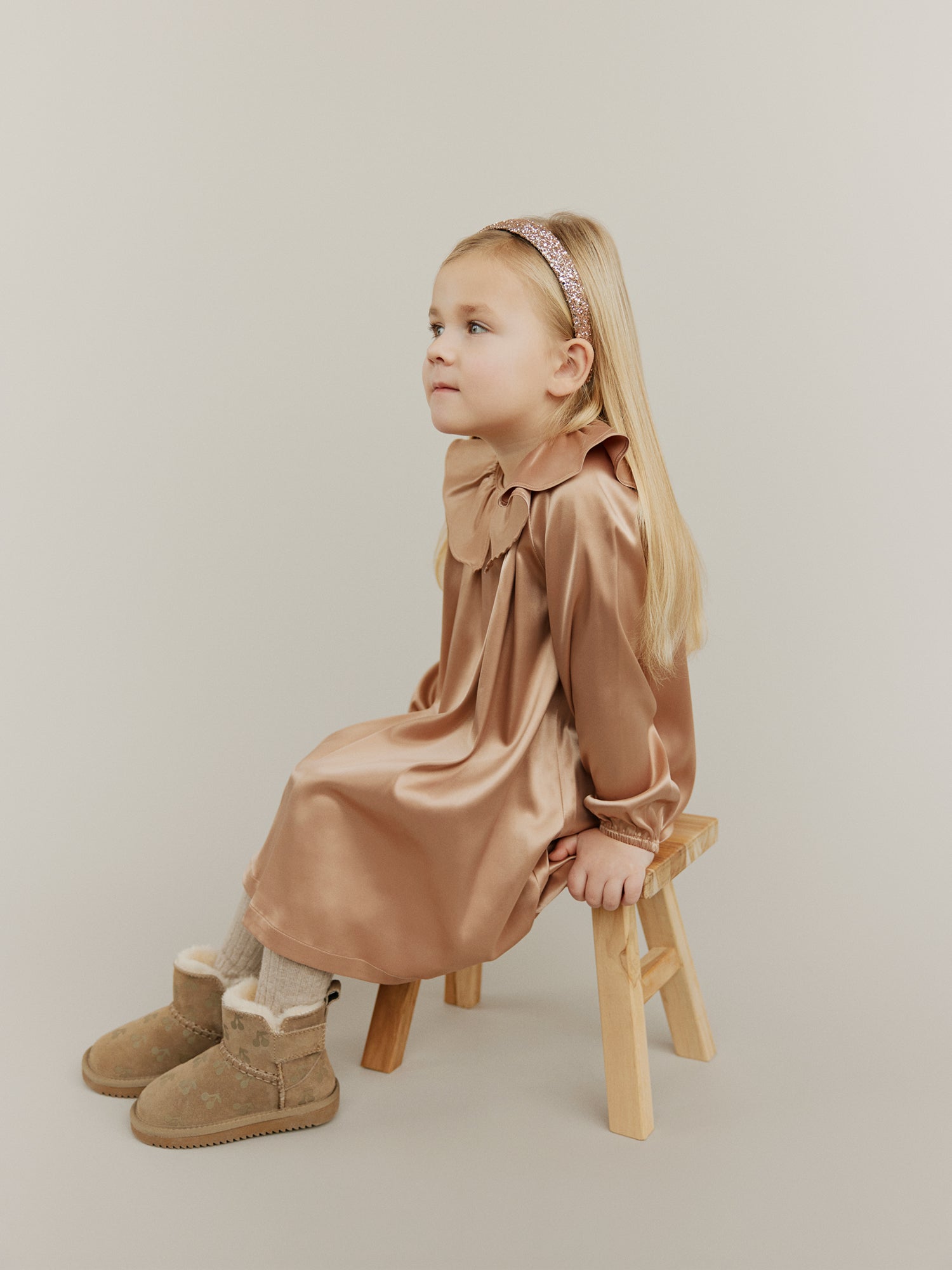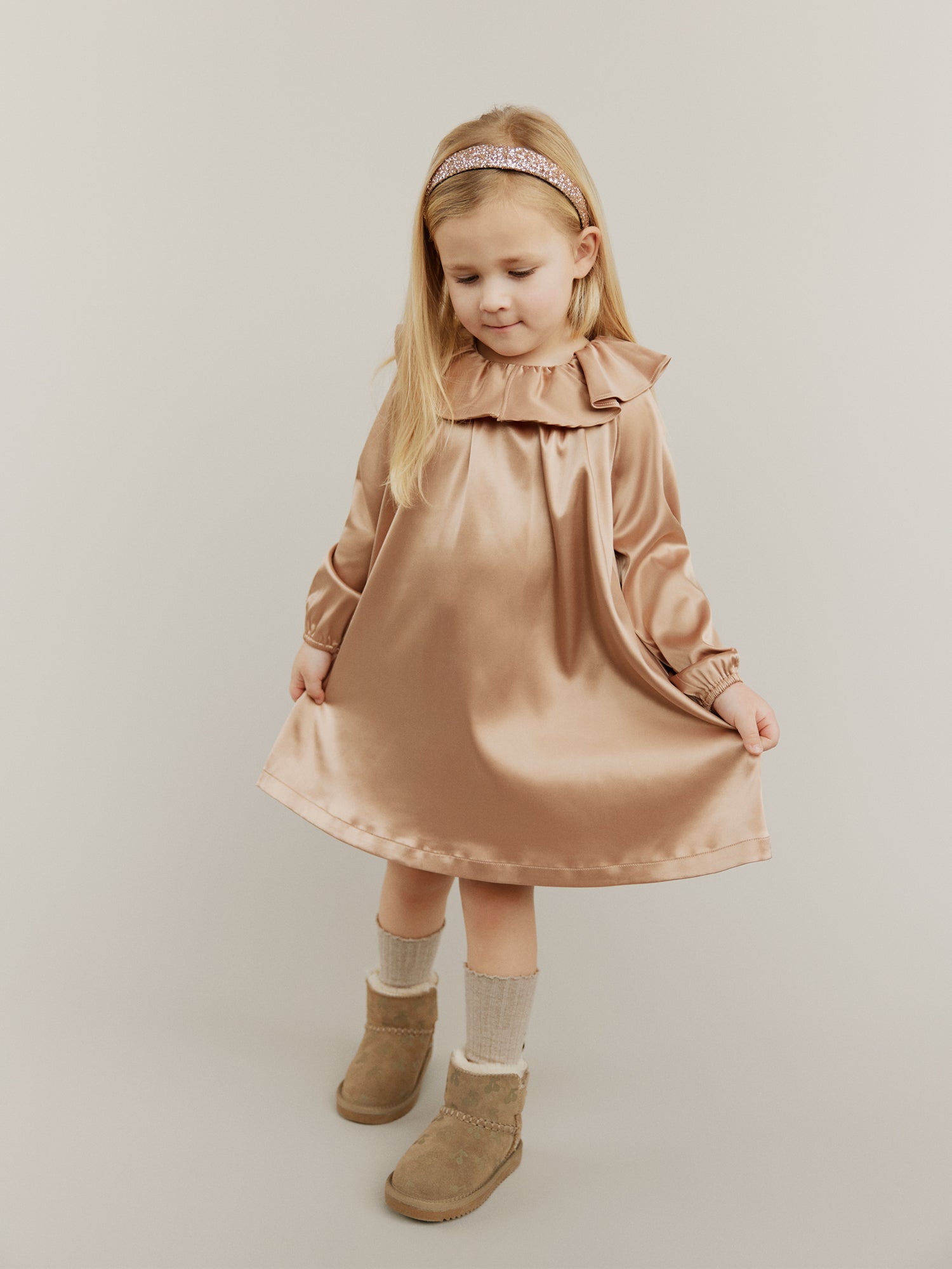 This collection is inspired by the magic of forgotten dances and whispered stories. Delicate lace collars, and shimmering tulle skirts swirl like snowflakes caught in golden light.