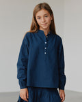 Sød nederdel i mørkeblå. Nederdelen har elastisk talje, asymmetriske detaljer og flæsedetaljer forneden. Fremstillet i 100% bomuld.