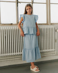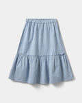 Top med lyseblå striber. Toppen har korte flæseærmer og en løs pasform med elastik i taljen