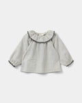 Løser bukser med fine sorte striber. Bukserne har elastik i taljen og små broderidetaljer ved anklerne